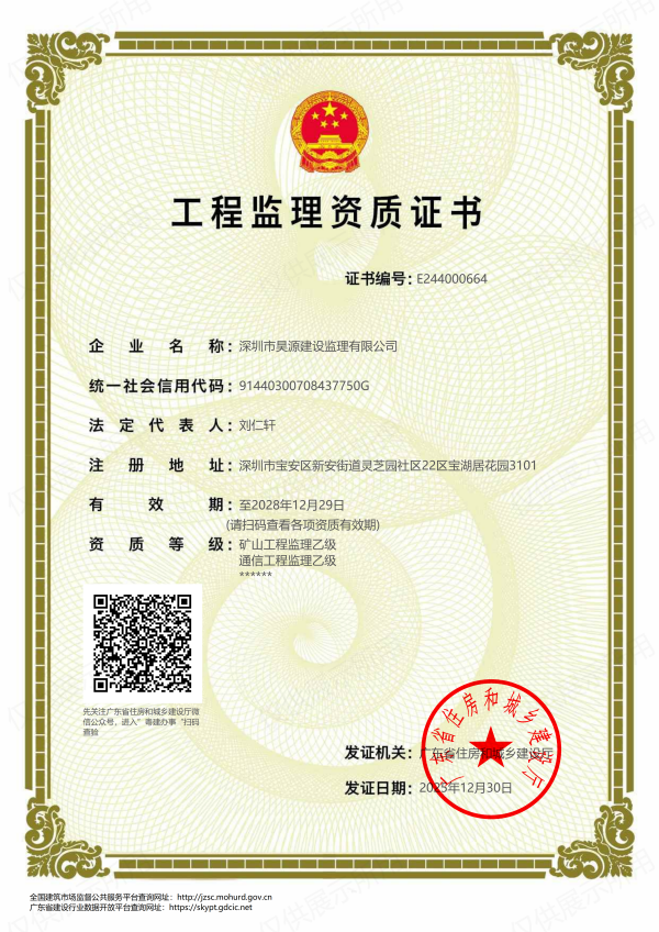房屋建筑工程监理甲级、市政公用工程监理甲级、机电安装工程监理甲级、电力工程监理甲级